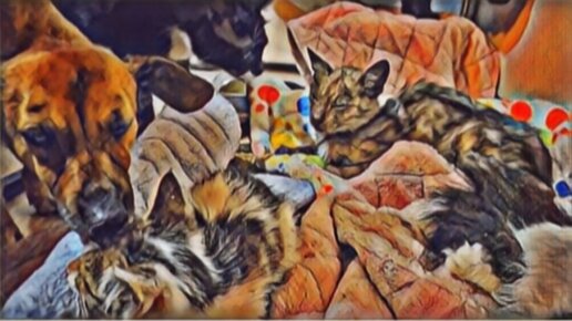 Собака Коко проводит свои процедуры и потом рядышком ложится, оберегает котячьего ребёнка.