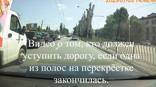 Видео о том, кто должен уступить дорогу, если одна из полос на перекрёстке закончилась. Наглядный пример дорожной ситуации.