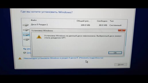 Установка windows на данный диск невозможна. Выбранный диск имеют стиль разделов gpt