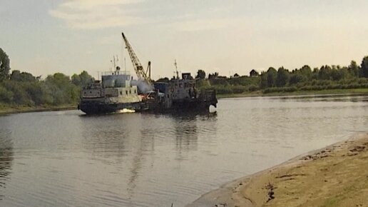 р. Тура 2023 г. Буксир тянет в залив корабль.