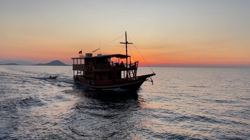 В открытом океане, закат, лодка