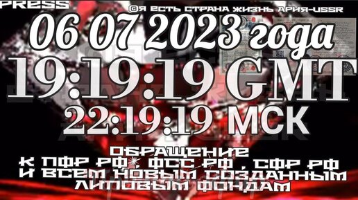 Эфир 06.07.2023 в19:19:19GMT ОБРАЩЕНИЕ К ПФР РФ,ФСС РФ,СФР РФ И ВСЕМ НОВЫМ СОЗДАННЫМ ЛИПОВЫМ ФОНДАМ