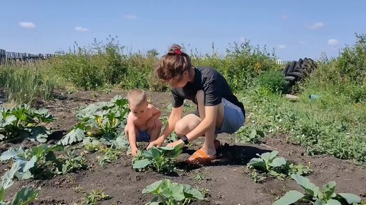 Сын помог маме прополоть огород.