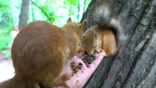 Две голодные белки едят орехи у меня с ладони