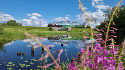 Краски селигерского лета: ретропоезд "Селигер" на фоне живописной реки Сорога проходит 104 км Бологое-Полоцкой дороги
