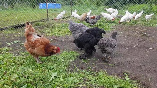 Накосили травы, куры купаются в зелени.