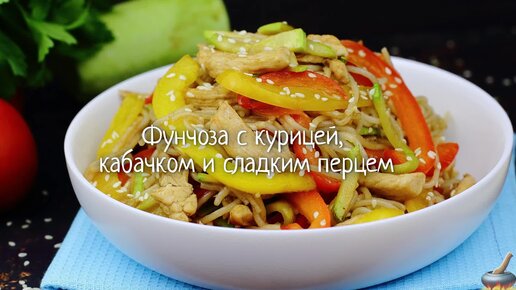 Готовится быстро, получается аппетитно и ярко! Фунчоза с курицей и кабачком.