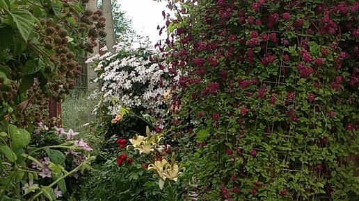 33 Клематис Пурпуреа Плена Элеганс - начало цветения, вдалеке белый клематис Хулдин - 08-07-2023