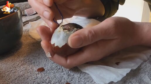 Чистим цыпленка без наклевки только с тупого конца, смачивая мембрану 🐣
