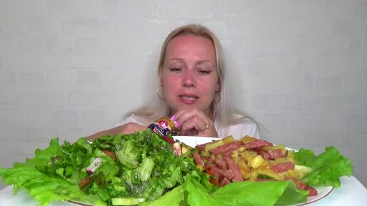 Кабачки с колбасой, очень зеленый летний салат. Вкусно. Мукбанг. Еда.