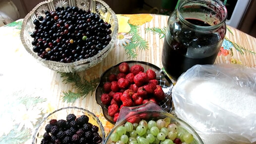 4 вида ягод- варенье ассорти: смородина чёрная, крыжовник, клубника, ежевика. Все ягоды в одинаковой пропорции: по 400-500 гр каждого вида.