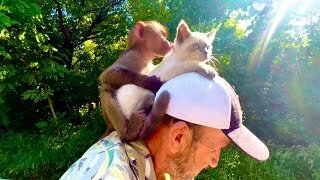 УНИКАЛЬНО! «Замученный» кот Басик в обнимку с «бешеной» гамадрилой Люськой катается по парку))