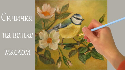 Синичка на ветке шиповника маслом/ Птичка на ветке