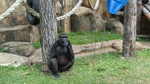 Западная равнинная горилла самка Ама ( 9 лет) без правой руки в Московском зоопарке.