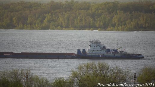 Теплоход толкач ОТ-2080 идет вверх по Волге мимо Волгограда вверх.