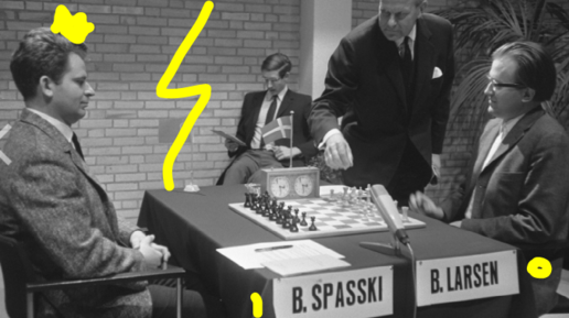 Игра высокого уровня Спасского: красиво одерживает белыми победу с матом над Ларсеном в Мальме, 1968. Черным пришлось расстаться с конем