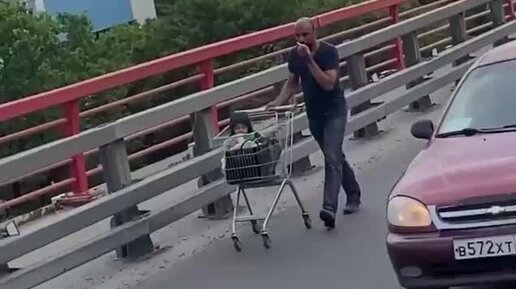 Мужчина вез ребенка в тележке по проезжей части на мосту