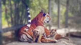 Маленькие тигры забавно играют с хвостом своей огромной мамы. Тайган