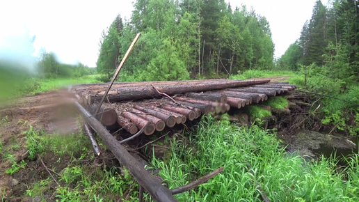 Поход в лес в сторону первой избы. Дорога после лесорубов. Новый мост через речку. Попали под дождь.