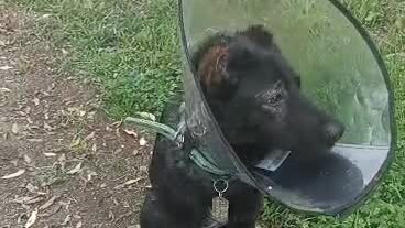 Гуляем с нашим подопечным Графом. Одели ему воротник, т.к. он порезался