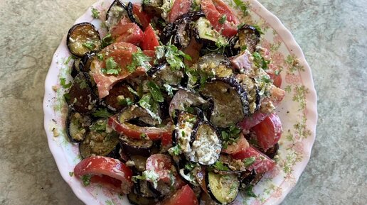 Тёплый грузинский салат с баклажанами, орешками, помидорами.