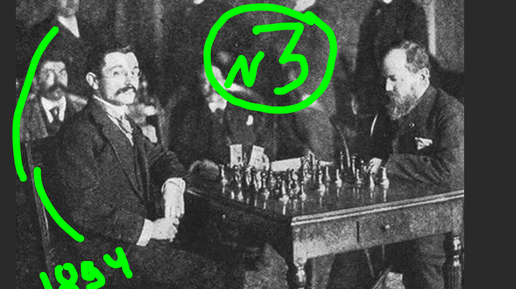 Э. Ласкер - В. Стейниц, партия №3 матча 1894 года в Монреале, 1-0: победа с доигрыванием до мата и показом ошибок с помощью стрелок