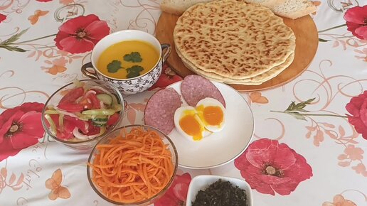 7. Жизнь в деревне. Обед по - деревенски. Кабачковый суп пюре, морковь по - корейски, варёное яйцо, салат.