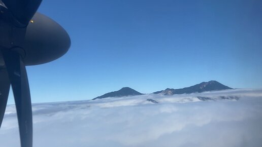 Снижение и приземление на острове Итуруп (Курилы) рейсом HZ4617 авиакомпании Аврора на самолёте Bombardier Q400 17 июля 2023