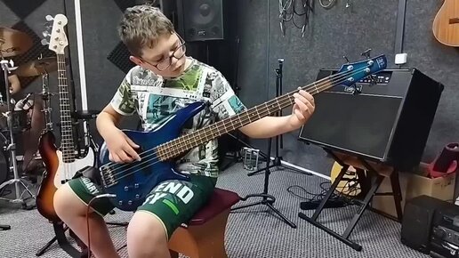 Наш ученик на бас-гитаре играет партию из песни "Трава у дома".