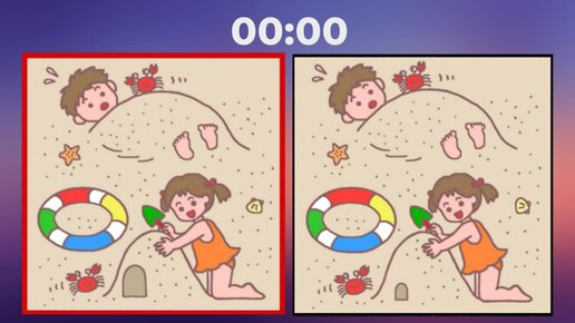 Мальчик и девочка играют на пляже. Найди три отличия на картинке.