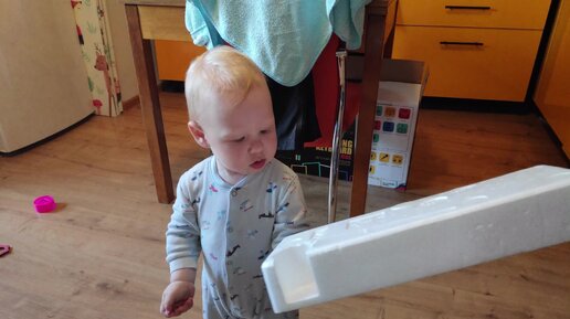 Годовалый малыш играет с куском пенопласта