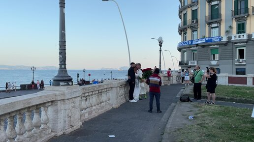 Италия, Неаполь. Молодожены фотографируются на набережной с видом на вулкан Везувий
