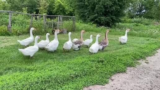 Гуси и утка с утятами на прогулке