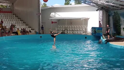 Хрупкая девушка-акробат, танцует с молодым белым китом в бассейне.
