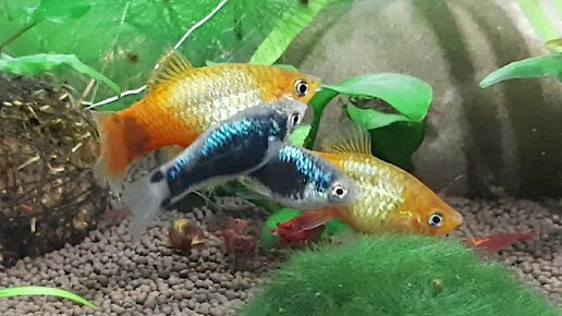 Четыре пецилии, креветки и один малек