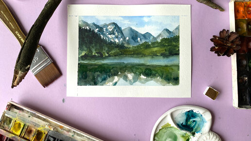 Рисуем пейзаж акварелью. Горы лес и озеро
