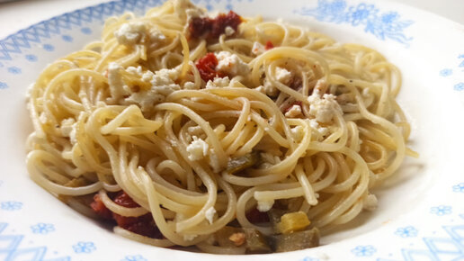 Паста с вялеными томатами перцем халапеньо и сыром сулугуни.
