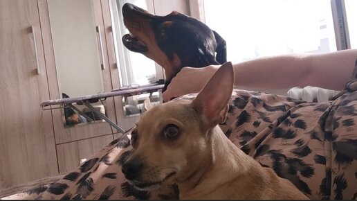 Доберман и той-терьер. Третий день вместе. Большая дружная семья. Встретили утром папа с коммандировки. Наелись всё вчетвером. Отдыхаем.