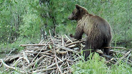 В Алтайском заповеднике в объектив фотоловушки попал медведь, разоряющий хатку бобров