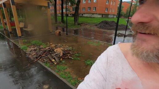 В шляпе и в футболке под проливным дождем. На качелях отдыхающих смыло водой