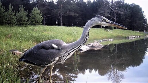 Цапля гуляет вдоль пруда в поисках пищи. Удачный кадр фото-ловушки