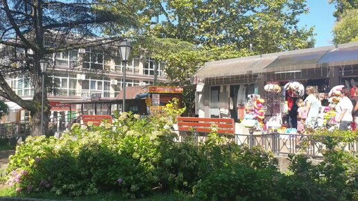 Дорога к морю. Сквер у почты. Лазаревское Сочи. Кинотеатр Восход. Погода 19 июля 2023. Днем воздух +29 С, вода +25 С