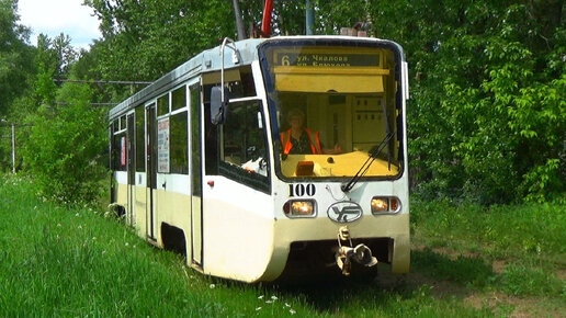 "Сквозь зелень!" Трамвай 71-619К (КТМ-19) №100 с маршрутом №6 "Улица Чкалова - Улица Блюхера"