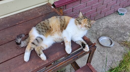 Обзор садового участка перед отъездом домой. Бездомная кошка наелась и разлеглась на крыльце. Кошка поправилась за лето. Клубника, земляника