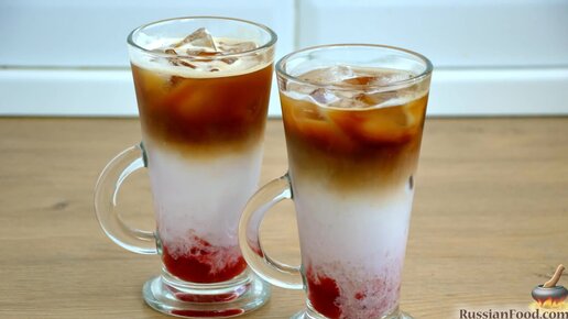 Красивый охлаждающий коктейль с ягодкой. Малиновый кофе с молоком.
