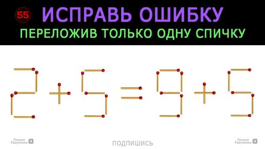 Головоломка со спичками 🥢🎓 2+5=9+5 😉 Исправь ошибку переложив всего лишь только одну спичку 😉😵