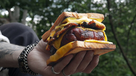 ЛЮБИМЫЙ СЫРНЫЙ ТОСТ с КУРИНОЙ РУБЛЕНОЙ КОТЛЕТОЙ в БЕКОНЕ на КОСТРЕ