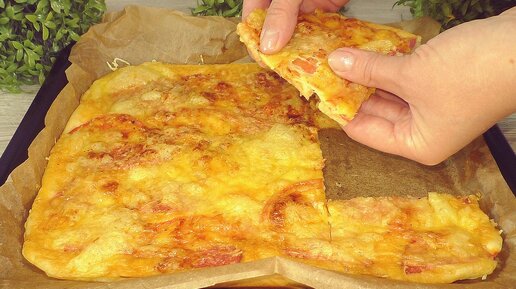 Большая пицца на заливном тесте, хватит на всю семью. Сочная нежная и без возни с тестом