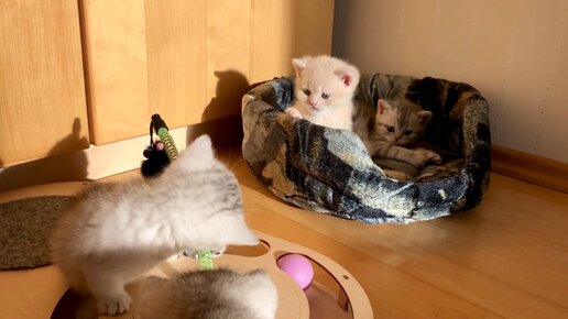 Очаровательные котята кошки Кайли играют на солнышке.