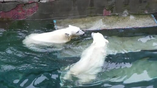 Медвежата дружно бегают, плавают и ныряют с айсберга вместе с канистрой.